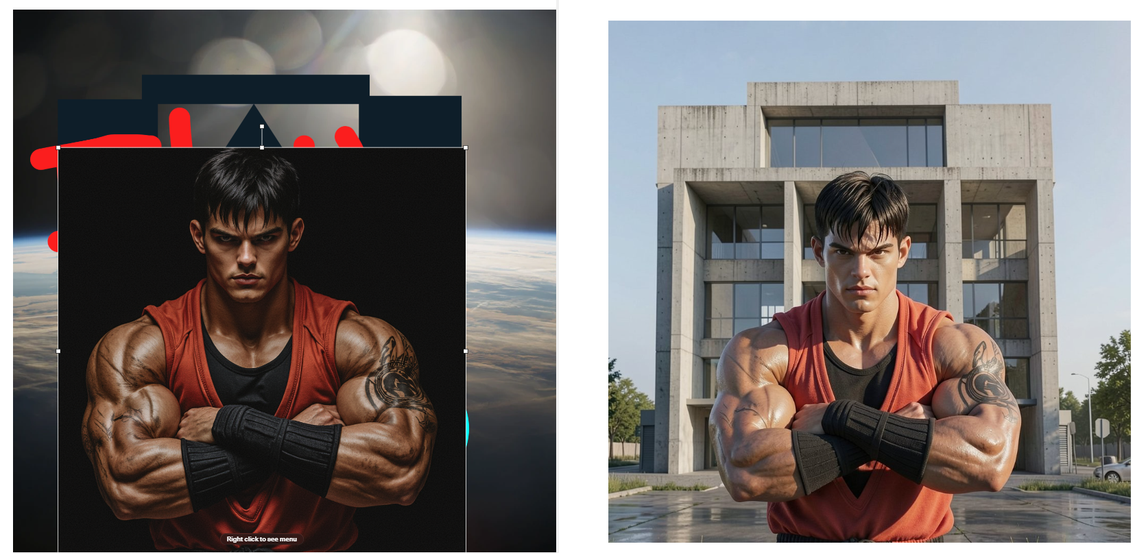 왼쪽은 이미지 사이즈를 2배로 키운버전, 오른쪽은 생성형업스케일로 이미지 사이즈를 2배로 키운버전